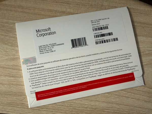 Una de las principales ventajas de la COA adhesiva Windows 11 Pro frente a cualquier otro formato de licencia es su validez legal ante auditorías de software. Incluye código de barras y número de serie conforme a los requisitos de Microsoft para distribuidores en la Unión Europea, siendo el único formato reconocido oficialmente para equipos ensamblados en entornos corporativos y administraciones públicas.